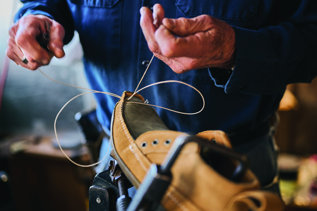 Dorman learned hand sewing at the Bass mill the way they’d always taught it, standing in a line of a dozen or so men, watching an instructor demonstrate the basic stitches from several feet away as the factory bustled around them. Most trainees quit in the first few weeks. Hand sewing can be tricky, tedious work. It’s also, for lack of a better word, pokey—even now, Dorman jabs his own fingers with his needles or diamond awl about once a week. In those days, only one in five trainees graduated to the production floor. Dorman refused to give up. “I was a stranger here. I had to make it.”