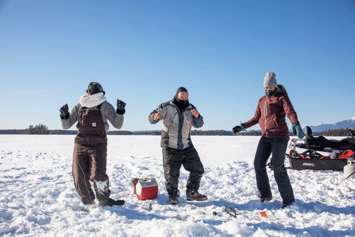 Kat and Carolyn head north to the New England Outdoor Center for a weekend of snowmobiling and ice fishing on the shores of Millinocket Lake.
