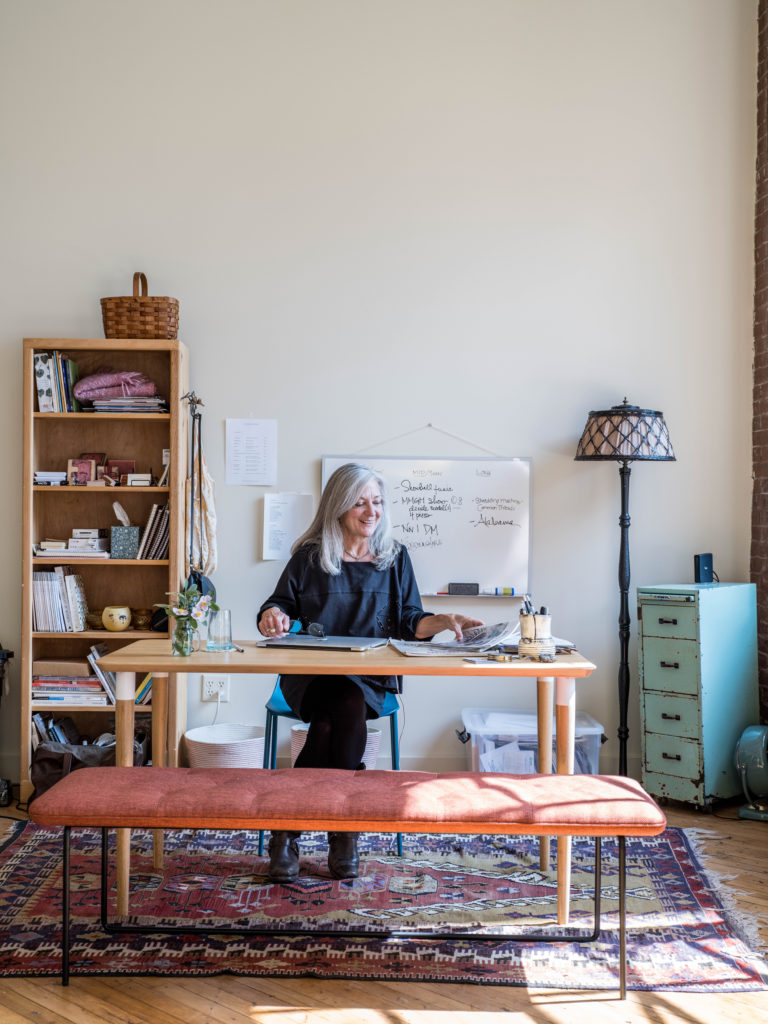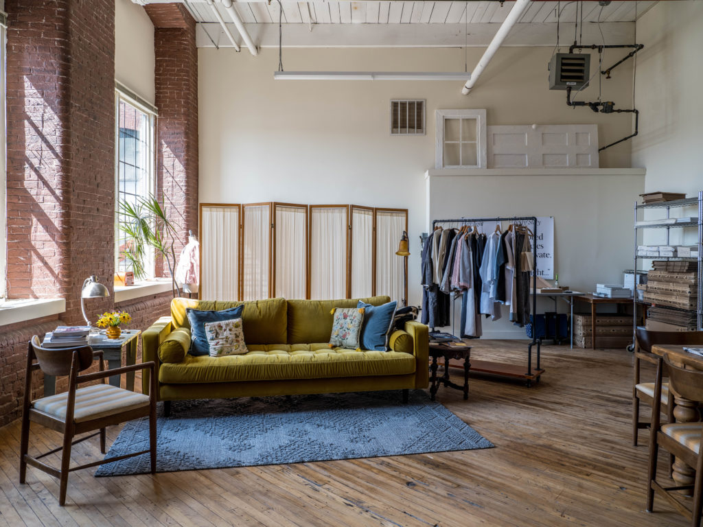 Tucked into a corner on the second floor of the Fort Andross Mill in Brunswick, Catherine Fisher’s light-filled studio is an airy, contemplative oasis. With large excerpts of text hung on the walls, a dressing screen arranged behind a pleasant yellow couch, and racks of garments made from linen, hemp, and organic cotton carefully organized throughout, the converted industrial space (reminiscent of New York City artist lofts) is the sort of place where one might expect a poet-cum-clothing maker to set up shop. “I don’t think of myself so much as a fashion designer,” says Fisher, who launched her eponymous business and clothing line in October of 2021. “I don’t feel it has so much to do with fashion as it does with a creative project that wants to connect with others through text and textile.” Indeed, each piece of clothing Fisher creates starts out as a poem, which is then translated into a carefully constructed garment meant to be “completed” by whoever wears it.