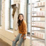 Fisher guides me through the studio, where she keeps a purposely small inventory of her clothing line to prevent unnecessary waste. A rack of samples holds versions of the 12 garments currently in Fisher’s repertoire, and she tells me about the poem behind each one. The composition that kicked off her entire collection is called “Half-Light,” which draws on shadow imagery to comment on how humans impact each other’s lives in both obvious and subtle ways. The top inspired by the poem reflects this sentiment with a semi-hidden panel in the back that depicts two overlapping silhouettes hand-painted by Fisher. Near the start of her poetry career, Fisher attended an event in Brooklyn, New York, called Universe In Verse, a yearly evening of poetry with over 1,000 people. In planning out the logistics of the trip, inspiration struck. “I just had this vision of a blouse,” she says, “that would be split up the back with a sort of curtain, and down the spine would be this sexy poem printed there. And, in my self- romanticization, I imagined that somebody would ask me about it, and then we would have a conversation, and I would have an interesting connection in the city.” Much like her poems taking on physical form through garments, when she returned from the trip, the idea for Catherine Fisher Clothing began to materialize.